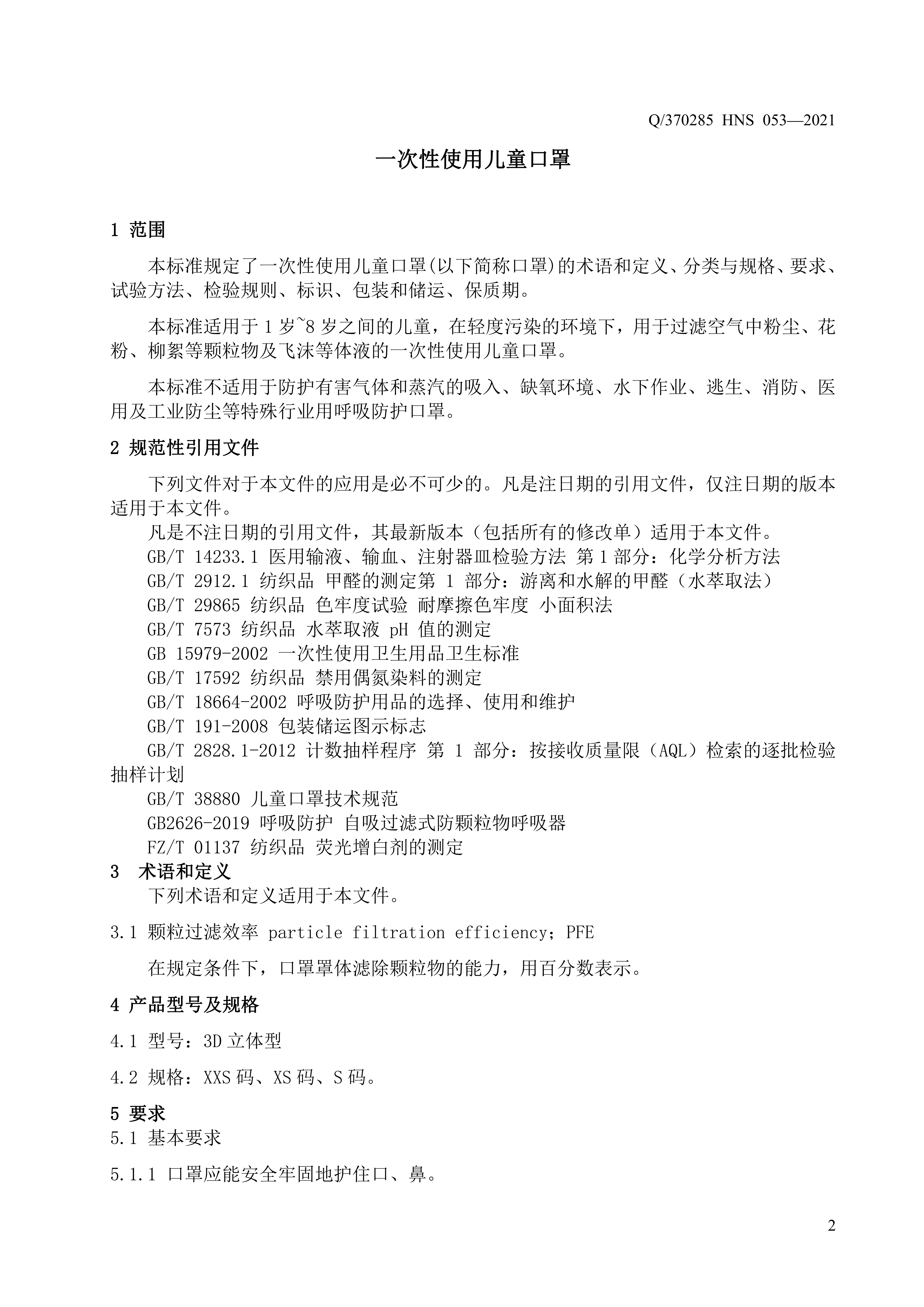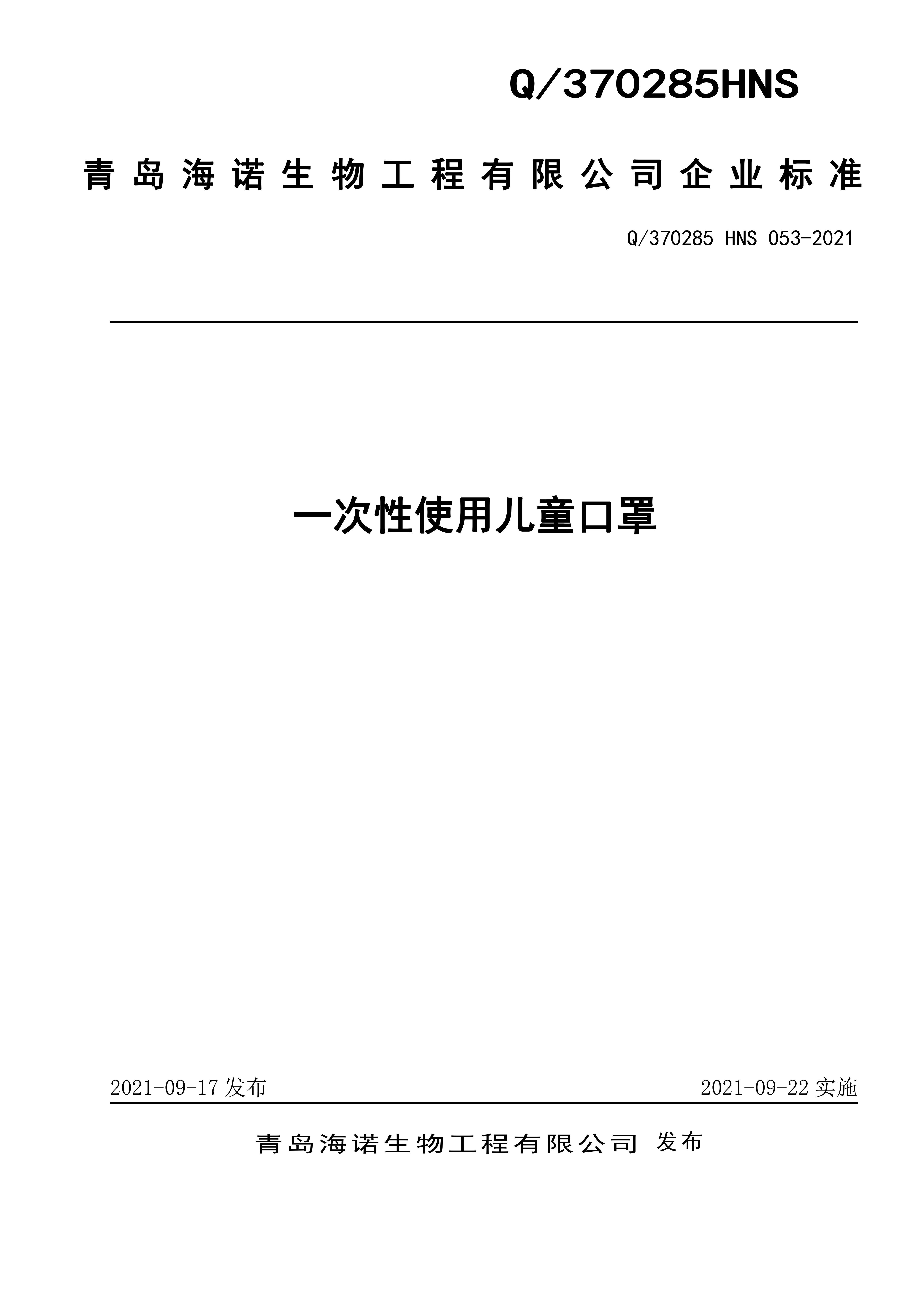 青島海諾生物工程有限公司企業(yè)標(biāo)準(zhǔn) — 一次性使用兒童口罩