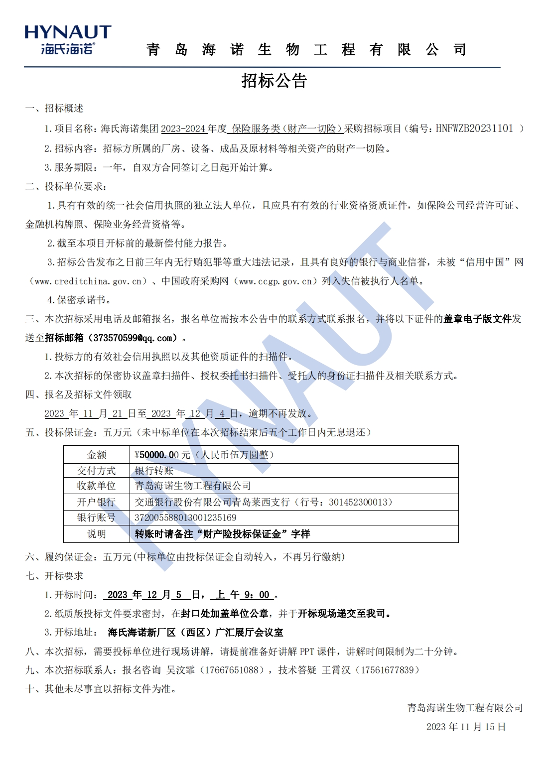 海氏海諾集團 2023-2024 年度 保險服務類(財產一切險)采購招標項目(編號:HNFWZB20231101 )