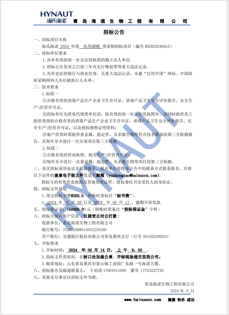 海氏海諾2024年度醫(yī)用酒精類采購(gòu)招標(biāo)項(xiàng)目(編號(hào) HNZB20240615)